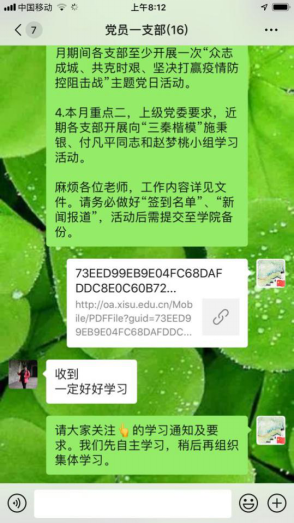 根据上级党组织要求,教工第一党支部提前规划,全体党员教师积极参与,3月份主要学习讨论内容:(1)学习“三秦楷模”施秉银、付凡平同志和赵梦桃小组;(2)给北京大学院鄂医疗队90后党员回信;(3)在首钢医院实习的西藏大学医学院学生回信等内容;(4)学习《规定》等。支部采取线上线下互动、自主学习、集体讨论的形式开展学习,气氛热烈。(亚博体育