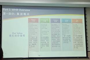 在第一部分温德姆集团概况的讲述中,刘忱介绍了温德姆集团“行之所至,无处不在”的使命、“正直、可靠、包容、关怀、快乐”的价值观、温德姆集团绿色计划和温德姆奖赏计划。较为直观的让同学们对温德姆集团有了大致的了解。