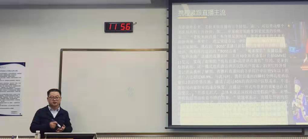 苏晓文总经理从OTA的定义与市场现状、OTA的商业与盈利模式、OTA酒店、机票、旅游业务体系以及OTA未来发展趋势六大部分着手为学生们介绍了在线旅游平台在旅游行业是如何发挥作用、如何运营的。讲座主要从学生们熟知的携程、马蜂窝、飞猪等Online Travel Agency讲解,分别介绍了不同OTA平台的市场现状、商业模式、盈利模式和业务概况。深刻而形象地分析了从供应端到消费端的一系列流程和机制,为同学们带来了别样的前沿信息。