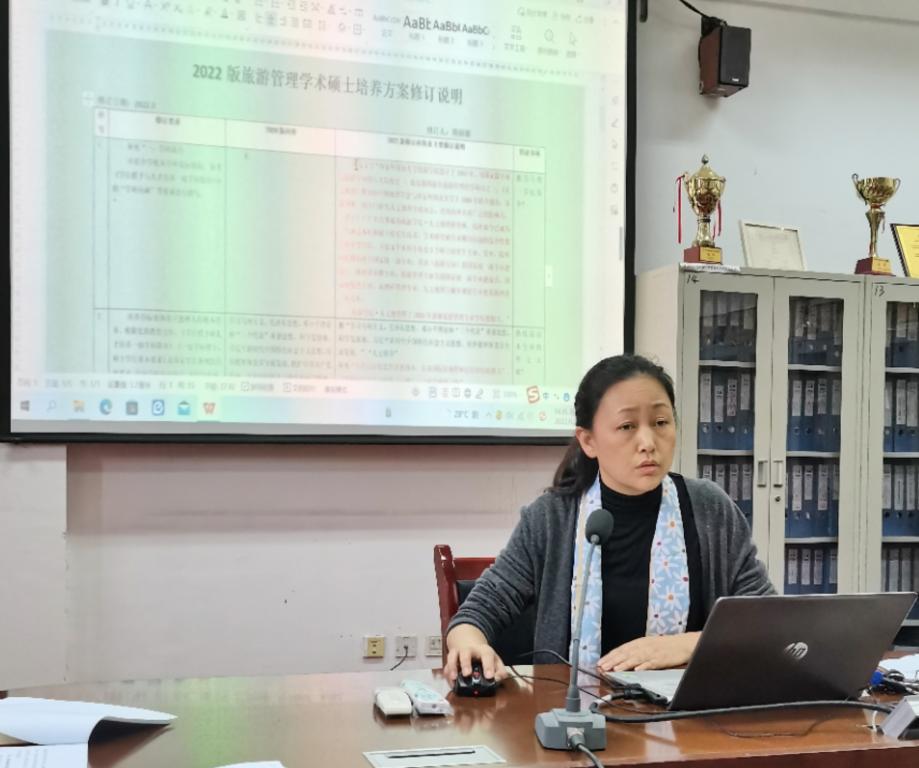旅游管理教研室主任隋丽娜就旅游管理学术型硕士研究生及旅游管理MTA专业型硕士研究生的培养方案修订意见和整体框架做阐释。地理学教研室主任段兆雯表示教研室经前期广泛调研和信息收集,依据西安外国语大学关于培养方案修订的指导性意见,初步形成了修订工作思路。与会老师围绕人才培养目标、课程体系、教学内容、教学模式、学位授予质量标准等方面展开讨论,针对研究生培养方案修订提出了具体修订意见。