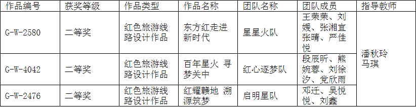 《旅游资源与开发》社会实践课程选送,潘秋玲教授和马琪老师指导2019级人文地理与城乡规划专业完成的《东方红走进新时代》《百年星火 寻梦关中》《红耀赣地 溯源筑梦》三个红色旅游线路设计作品获得西北赛区二等奖,班级参赛获奖比率高达60%。