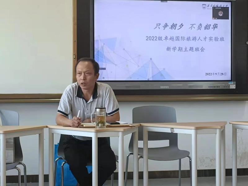 于教学楼A405教室召开了2022级卓越国际旅游人才实验班(旅卓)师生见面-座谈会。院长李开宇、学院党委副书记上艳妮、旅游英语教研室主任杨国庆、2022级旅卓班主任黄观、2021级旅卓学生代表及2022级旅卓全体同学参加了此次会议,会议由班主任黄观主持。
