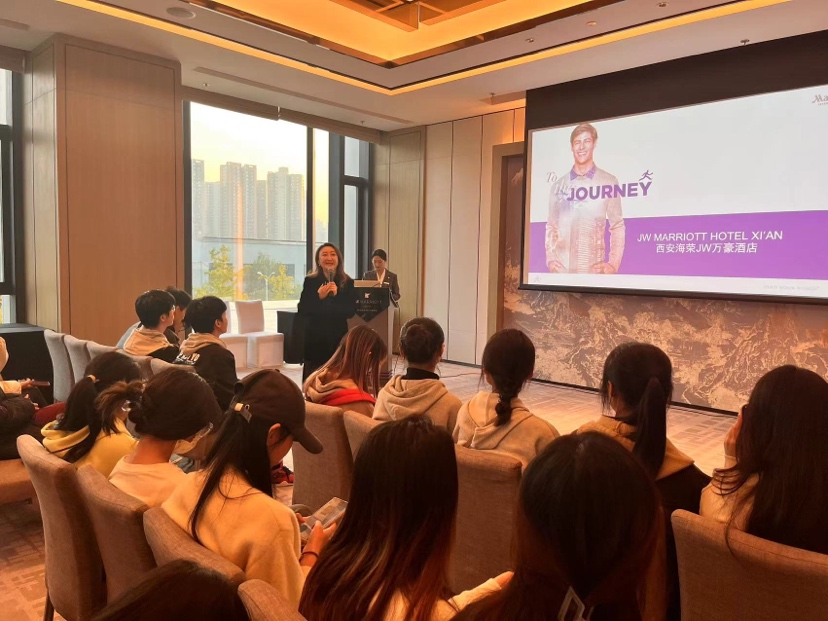 新近开业的西安海荣JW万豪酒店是一家将古代长安的美与现代JW万豪品牌特色巧妙结合的高端酒店。酒店人力资源部总监Fiona Qiao乔佳,为同学们详细介绍了万豪的品牌理念,发展历史,和运营管理。学生们体验了酒店的高端服务和现代化设计。通过实地考察以及和优秀员工的交流,对如何提供个性化和高端化的服务有了更深入的理解。