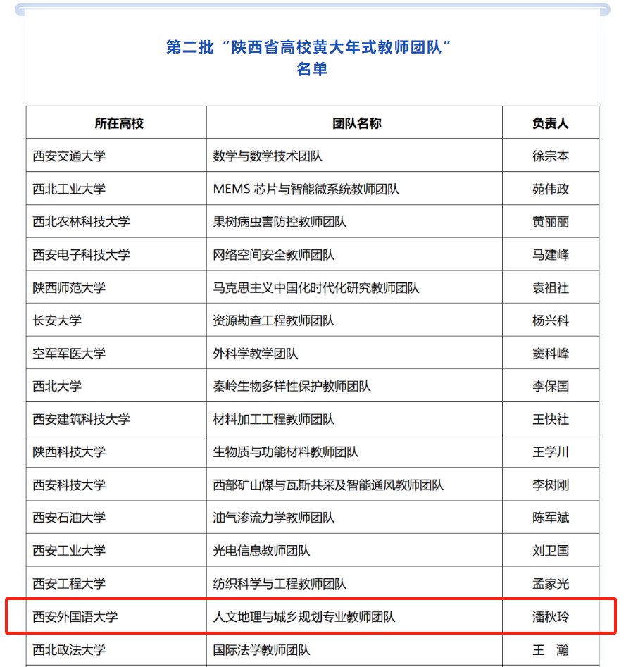 “我们作为文科类高校里的理科团队,在申请陕西省‘黄大年式教学团队’时要去和省内各大工科类高校竞争,所以我们的团队在申报时并没有太大的优势,整个过程也非常有难度。”回忆起申报时的艰辛,团队负责人潘秋玲老师很是感慨。她坦言,今年已经是团队的第三次申请,经过前两次的失败,大家都不免有些失落。但团队成员的鼓励、学校和学院的支持和“展示西外成果,发扬团队精神”的使命感让她决定再试一次。潘老师再一遍耐心整理资料,一步一步将申报书逐渐完善,细心筛选掉旧的材料,补充进新的事迹,将全队的心血都融进2000字的申报书里。终于,在今年的公示名单中,“西安外国语大学人文地理与城乡规划专业教师团队”一行名称如愿出现,与全省其他28个院校入选团队共称“陕西省高校黄大年式教师团队”,一切的努力与坚持都有了回答。