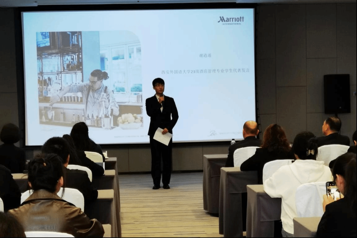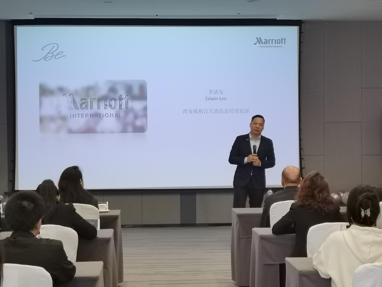 西安威斯汀酒店总经理Edwin Lee上台致辞,他向师生们表示热烈欢迎,并介绍了自己在酒店业的成长经历,鼓励同学们扎实肯干,珍惜这次机会,并欢迎同学们未来能够加入万豪集团且有所成就。