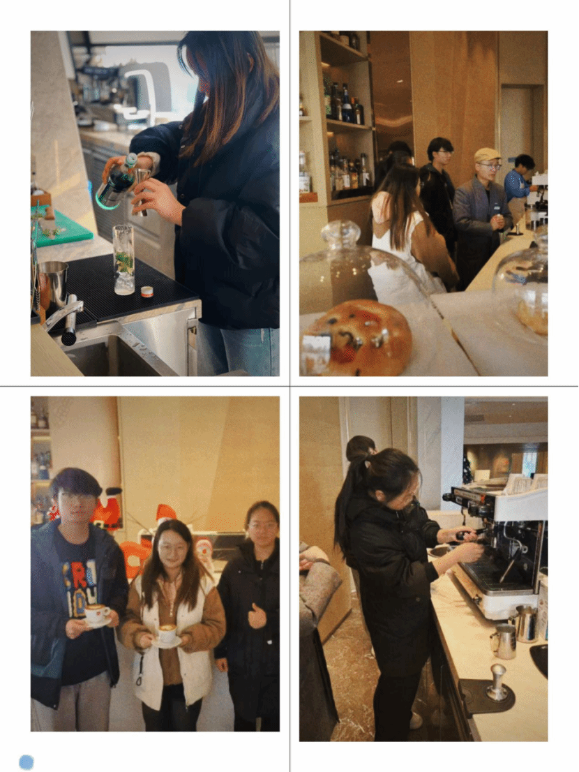 12月11日,课程以翻转课堂的形式进行,主题为酒店餐饮服务及运营。学生们分组前往西安浐灞艾美酒店、西安高新区喜来登酒店、西安海荣JW万豪酒店和西安威斯汀大酒店,实地学习咖啡、鸡尾酒艺术以及餐饮数字化运营。大堂吧经理悉心讲解咖啡冲泡方法,同学们在专业指导下,深入学习咖啡拉花、手冲咖啡等技艺,将理论与实践紧密结合,创造出独具匠心的咖啡作品,丰富了对酒店餐饮服务及运营的理解。