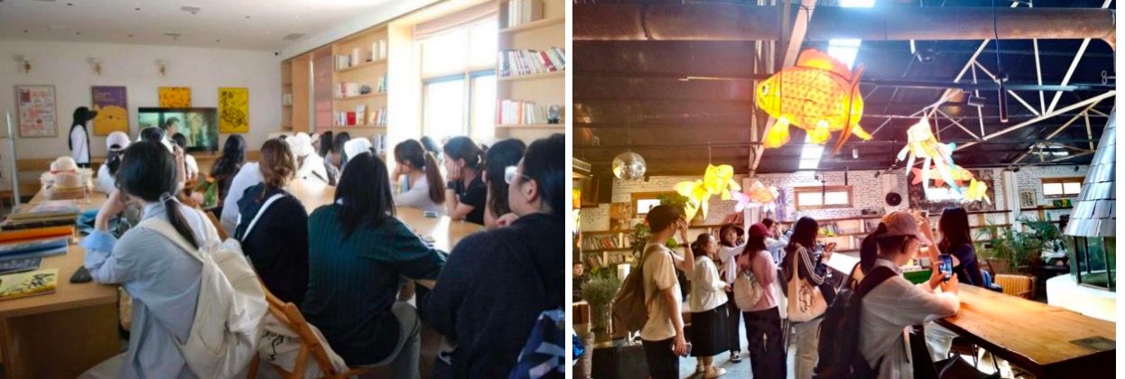 研学团队首站抵达蔡家坡村。同学们跟随讲解员走进村史馆和麦田剧场,观看宣传片,感受乡村美景,见证了艺术与乡村共生的鲜活案例。西安美术学院师生创作的画作与农具陈列相映成趣,将农耕记忆转化为文旅IP,连续七届的“关中忙罢艺术节”以大地为舞台,通过稻田音乐会、农民诗会等活动,吸引游客纷至沓来。同学们不禁感叹,课本中的‘文旅融合’在这里有了具象表达——土坯房成了美术馆,老农具成了艺术装置,乡村的‘土气’变成了‘底气’。