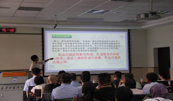 最后,张波老师从学生工作角度出发,介绍了学院的奖助学金、学生组织、考研、就业、出国、心理健康教育和职业规划教育。张老师特别提醒与会家长,就业、考研、出国留学是我校毕业生去向的主力方向,其中就业是大头,各位家长可以鼓励孩子“一颗红心,两手准备”。家长们要结合孩子的性格、特长,帮助他们建立科学的职业规划观。