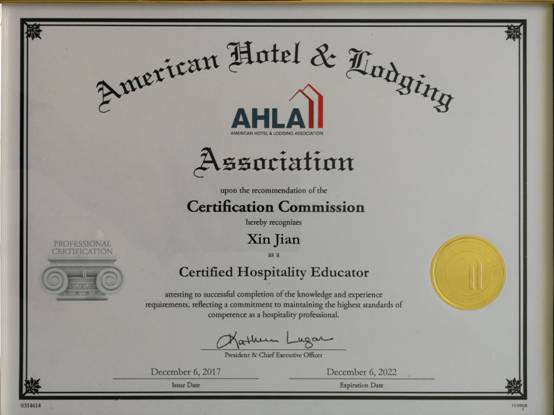 教师辛健此次获得CHE认证,进一步加强了酒店管理专业双师型教师的结构优化,为酒店管理专业与美国饭店协会进一步深入合作打下了坚实的基础。
