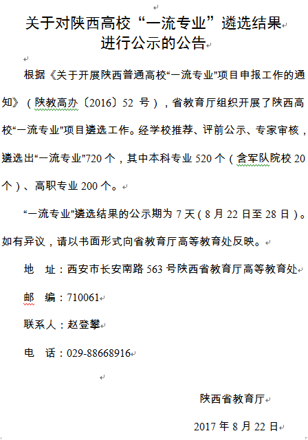 根据《关于开展陕西普通高校“一流专业”项目申报工作的通知》(陕教高办〔2016〕52号),省教育厅组织开展了陕西高校“一流专业”项目遴选工作。经学校推荐、评前公示、专家审核,遴选出“一流专业”720个,其中本科专业520个。我校获批本科专业17个,其中亚博体育