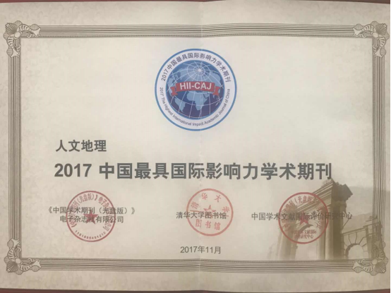 2017年11月22—23日,在京举行的第三届“中国学术期刊未来论坛”颁布了 2017“中国最具国际影响力学术期刊”与“中国国际影响力优秀学术期刊”。我校《人文地理》凭借其较高的国际他引影响因子、国际被引频次、国际量效指数、可被引文献比等评价指标,再次入选“2017中国最具国际影响力学术期刊”,并在60种入选“2017中国最具国际影响力学术期刊” (人文社会科学)中排名第29位,创下了《人文地理》六年获评的最佳成绩。