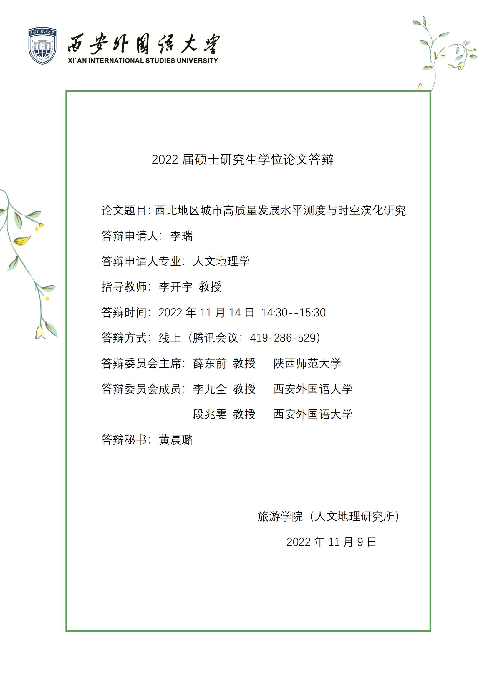 2022届硕士研究生秋季学位论文答辩预告