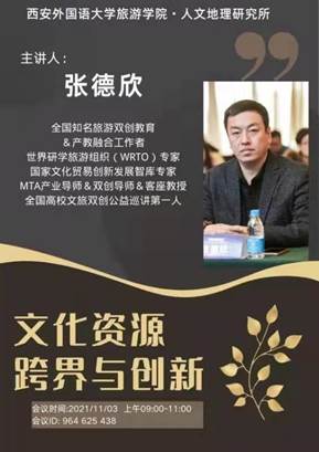 会议伊始,隋丽娜老师对主讲人张德欣进行了简要介绍。张德新院长是全国知名旅游双创教育和产教融合工作者、教育部全国专业学位水平评估专家、同时也担任MTA产业导师、双创导师、客座教授、文旅创新创业研究院执行院长、《中国文旅创新创业智库丛书》总编等多重身份。张院长致力于搭建文旅创业科技创新服务平台,连接旅游学术界与产业界,曾组织过百余场社会类创业活动。著有《中国文旅产业创新创业评论》并主编《中国文旅企业创新创业发展报告》、《旅游创业启示录》、《中国旅游电商简史》等系列文旅双创新书籍十余部。