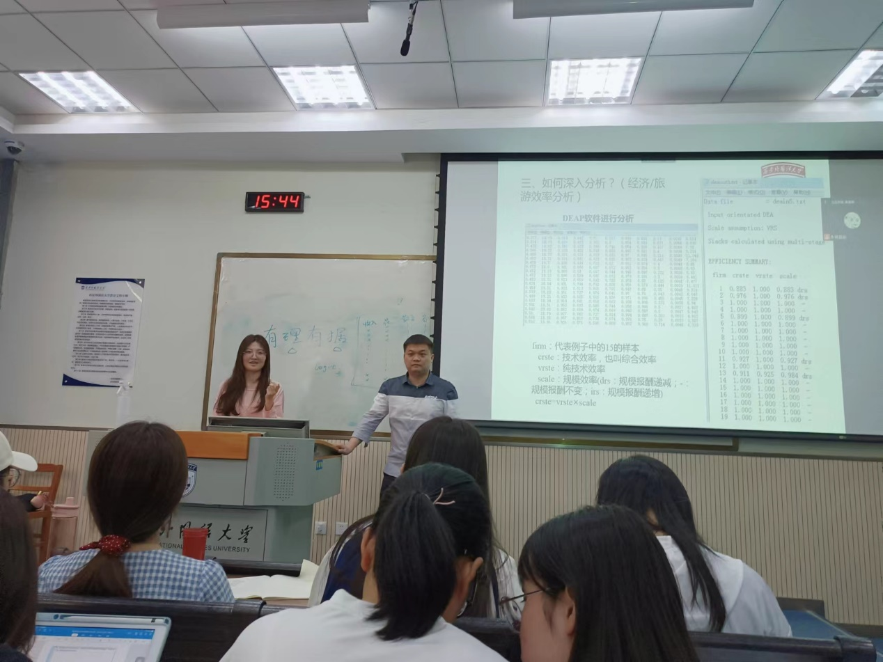 讲座伊始,陈乐老师通过向大家提出问题的方式引出课程内容,从论文撰写中的图片排版问题、学生小组参赛时PPT的制作、网页宣传、微信推送等方面解释数据在实证分析中的重要性;从宏观数据、微观调查数据、爬取数据等数据的来源向同学们展示了获取数据的手段方式;通过认识数据、清洗数据、数据可视化三个阶段向同学们讲解如何开展数据分析以及如何通过数据包络法深入分析数据。