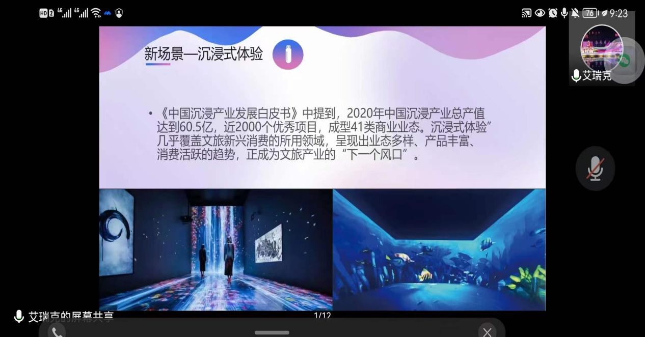 费文娟总经理为同学们介绍了三次数字化浪潮对全球发展产生的深远影响,深刻阐明了AR、VR、MR到MR等新技术的发展对文旅产业融合的加持作用。费总结合大量文旅行业内生动有趣的案例,从《梵高的世界》、《故宫数字展》、《数字敦煌》、《云上龙门》、《这有山》、《簋唐楼》再到《长安十二时辰》,为同学们展现了一幅幅栩栩如生的沉浸式体验画卷。