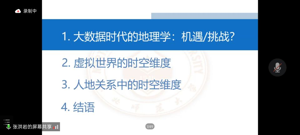 张洪岩教授从大数据起源、人工智能与大数据、深空探测等引出地理信息科学(GIS),并介绍地理学的时空融合、地理学发展的循环关系。同时张教授通过现代地理学等于真实空间加数字空间引出了地理虚拟世界的时空维度,从地理场景学、创新GIS数据结构、地理学三大定律、地理学中的复杂性等,详细介绍了地理学中虚拟世界的时空维度,并从人地关系的自然属性—作为生物的人与环境的关系、人地关系的社会属性—作为社会的人与环境的关系、跨越时空的人地关系、六次空间革命的发展、人地关系的载体—景观等,深入浅出地分析了大数据时代的地理学发展趋势。