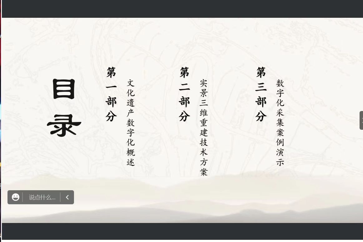 讲座伊始,王位宁部长进行了文化遗产数字化采集的讲解,从采集对象、采集内容、采集流程和设备等方面向我们进行介绍。让我们对文化遗产的类型和其数字化中所蕴含的知识有了一定了解。
