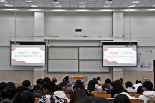 在SD307教室举行2019级本科生“笃实进取,从心出发”为主题的年级大会,大会由学生代表王子琪主持。班主任王鹏涛老师,2019级辅导员胡森文老师及2019级全体本科生参会。