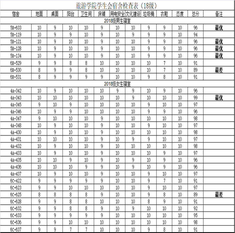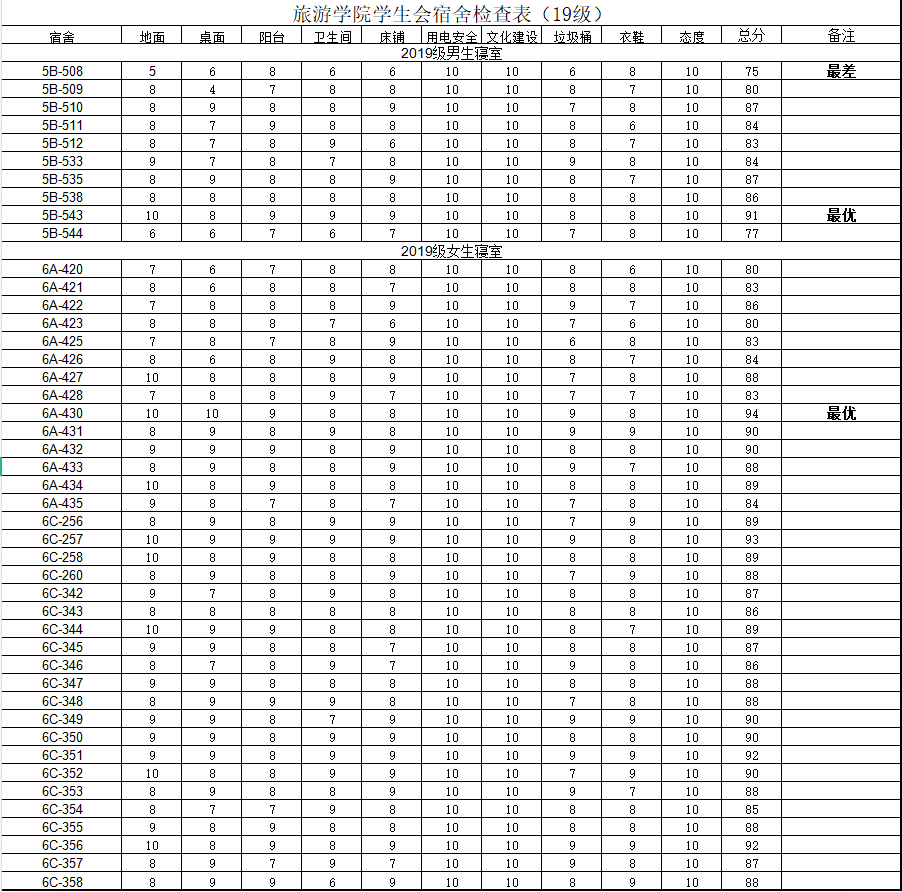 2018级辅导员高野、2019级辅导员胡森文带领学生会基础事务与权益部的学生干部开展本学期第一次全院宿舍大检查。现将检查结果公布如下: