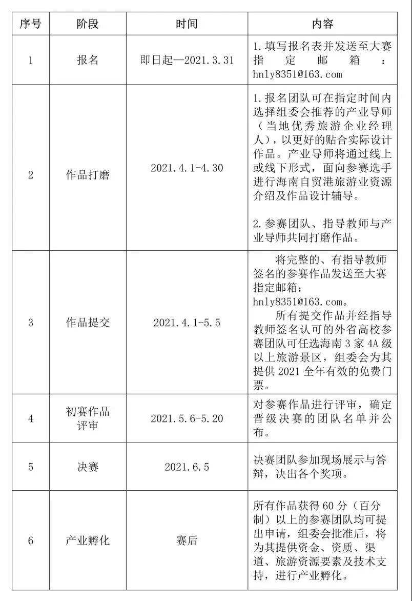 5.所有提交作品并经指导教师签名认可的外省高校参赛团队可任选海南3家4A级以上旅游景区,组委会为其提供2021全年有效的免费门票。