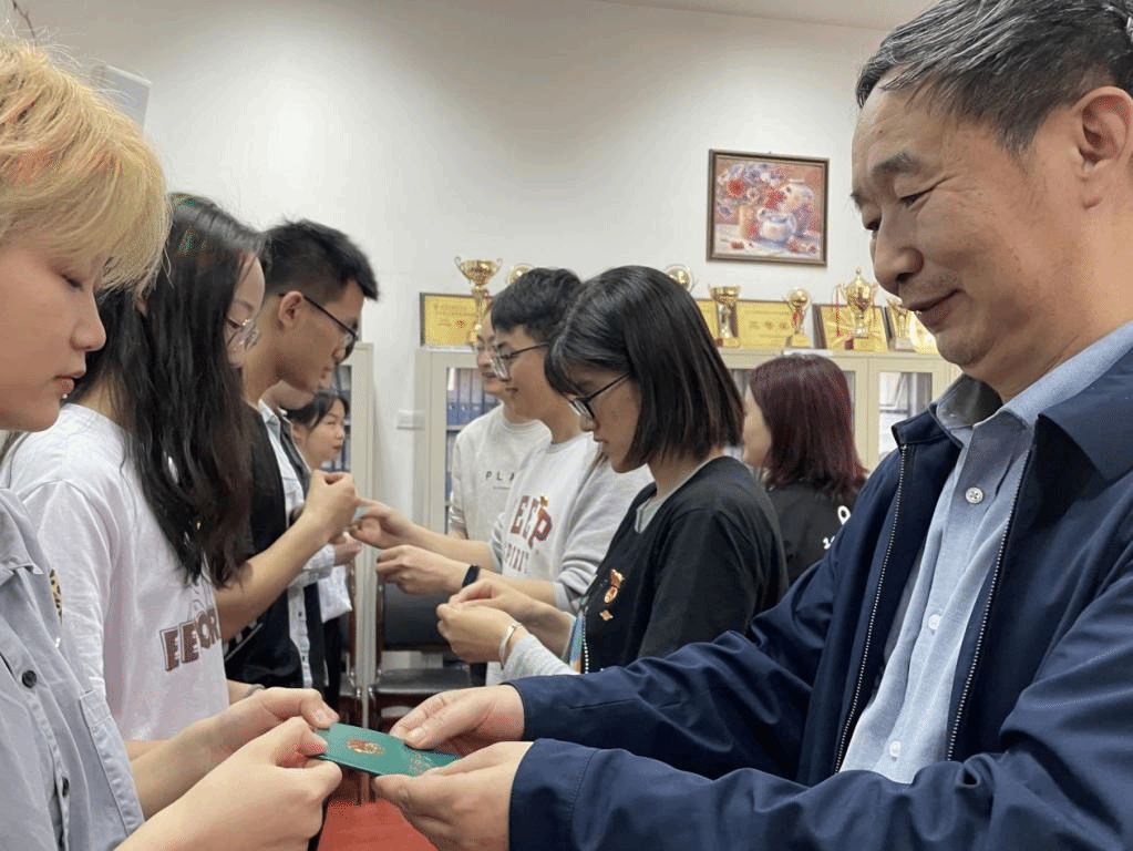 在庄严嘹亮的国歌声中,入团仪式拉开序幕。焦议介绍了学院团员发展情况,并宣读了新团员名单。随后与会老师们上台为新团员代表颁发团员证、团章并佩戴团徽。