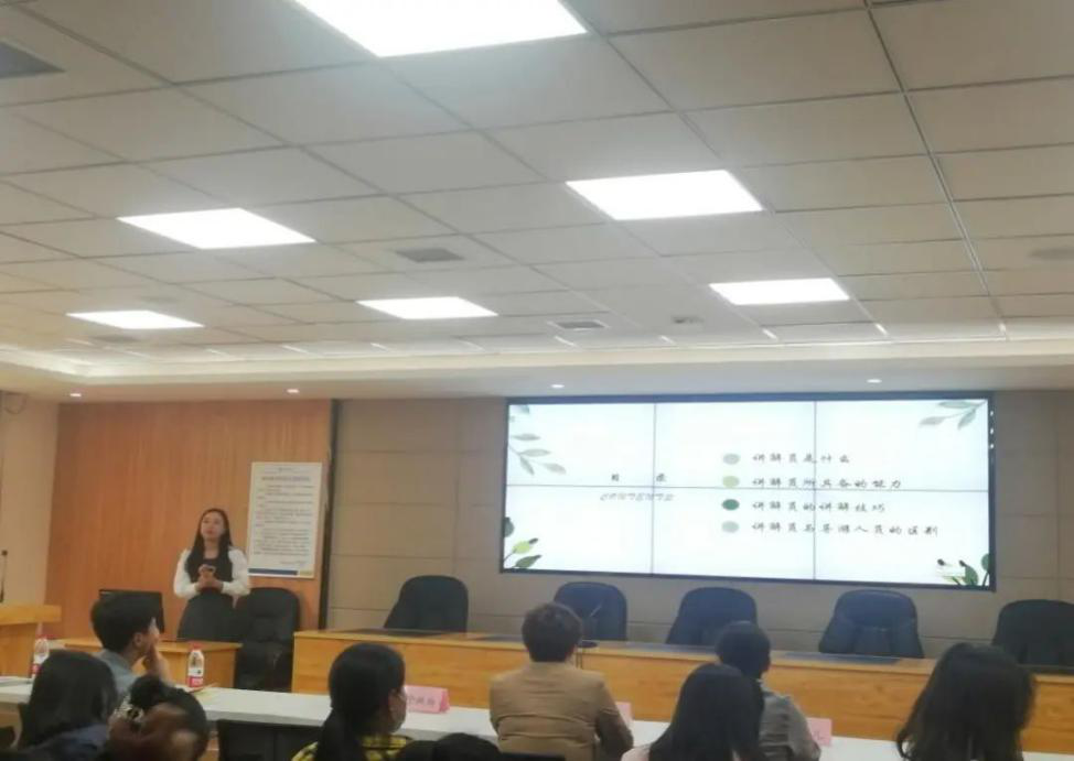 随后,吴老师进行了讲解员相关知识的讲授,主要内容包括讲解员是什么、讲解员和导游的区别、讲解员所具备的能力,以及讲解时的技巧。她提醒同学们在讲解时内容应具有趣味性,避免枯燥乏味。当出现“独角戏”场面时,可通过反客为主的形式吸引游客。