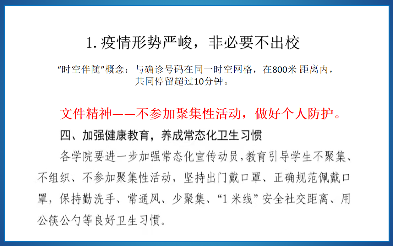 为引导青年学生厚植爱国爱校情怀,强化责任担当,坚决树牢战胜疫情的信心和决心,10月21日晚,结合学校疫情防控工作会议精神和《关于加强近期学生疫情防控工作的通知》文件要求,亚博体育