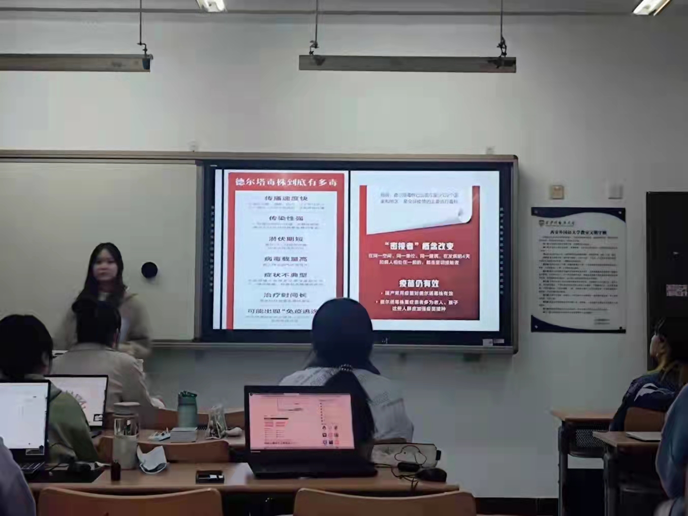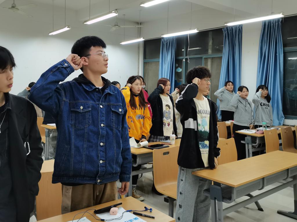 当晚,红船理论研习社走进班级,走近学生,面向2021级本科生,开展“宣讲抗疫形势,共同承诺践诺”活动。宣讲活动中,社团成员宣讲国内最新疫情态势,讲解德尔塔病毒特性,传达疫情防控要求。活动在同学们铮铮的承诺誓词中结束。