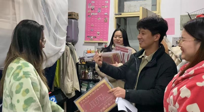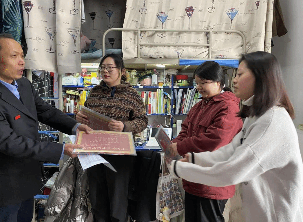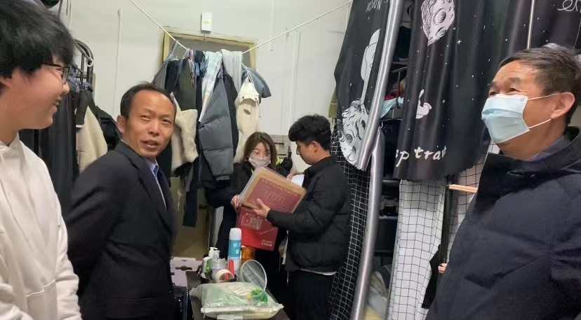 党委书记郭建平、院长李开宇、辅导员高野及学生党员代表一行深入2018级考研学生寝室走访慰问,并为学子发放考研福袋,送上学院的关心与祝福。
