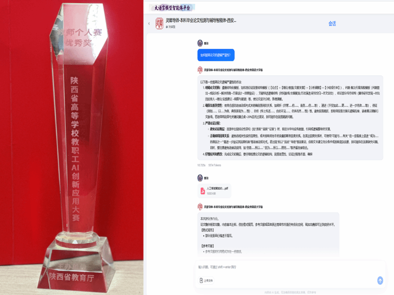 个人赛道中,童玲老师团队参赛的《灵犀导师——本科毕业论文检测与辅导智能体》紧扣教学评价改革需求,打造集论文智能检测、学术规范引导、个性化辅导于一体的智能辅助系统,成为“AI+教育”赋能教学评价的典型案例。